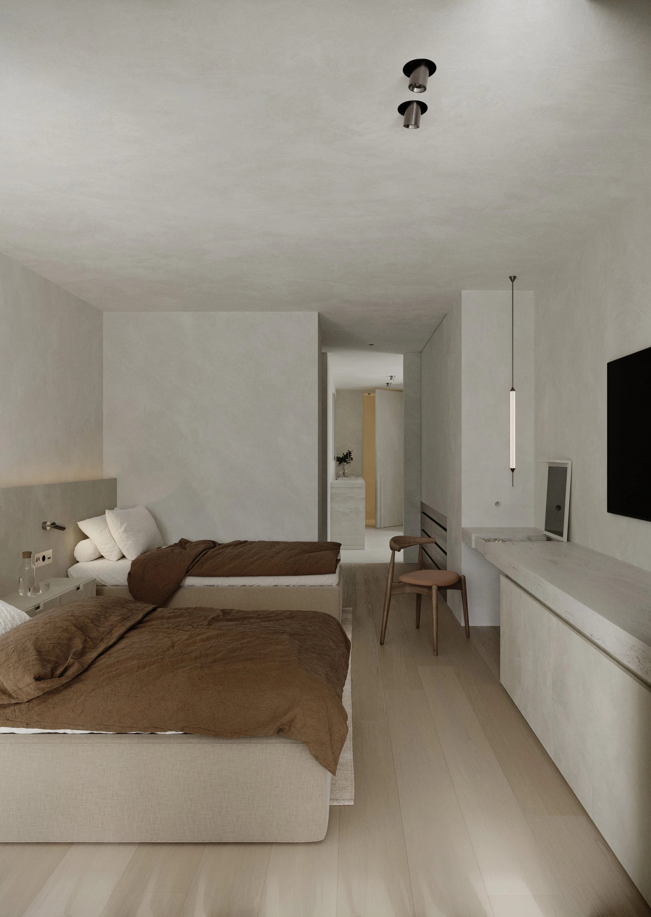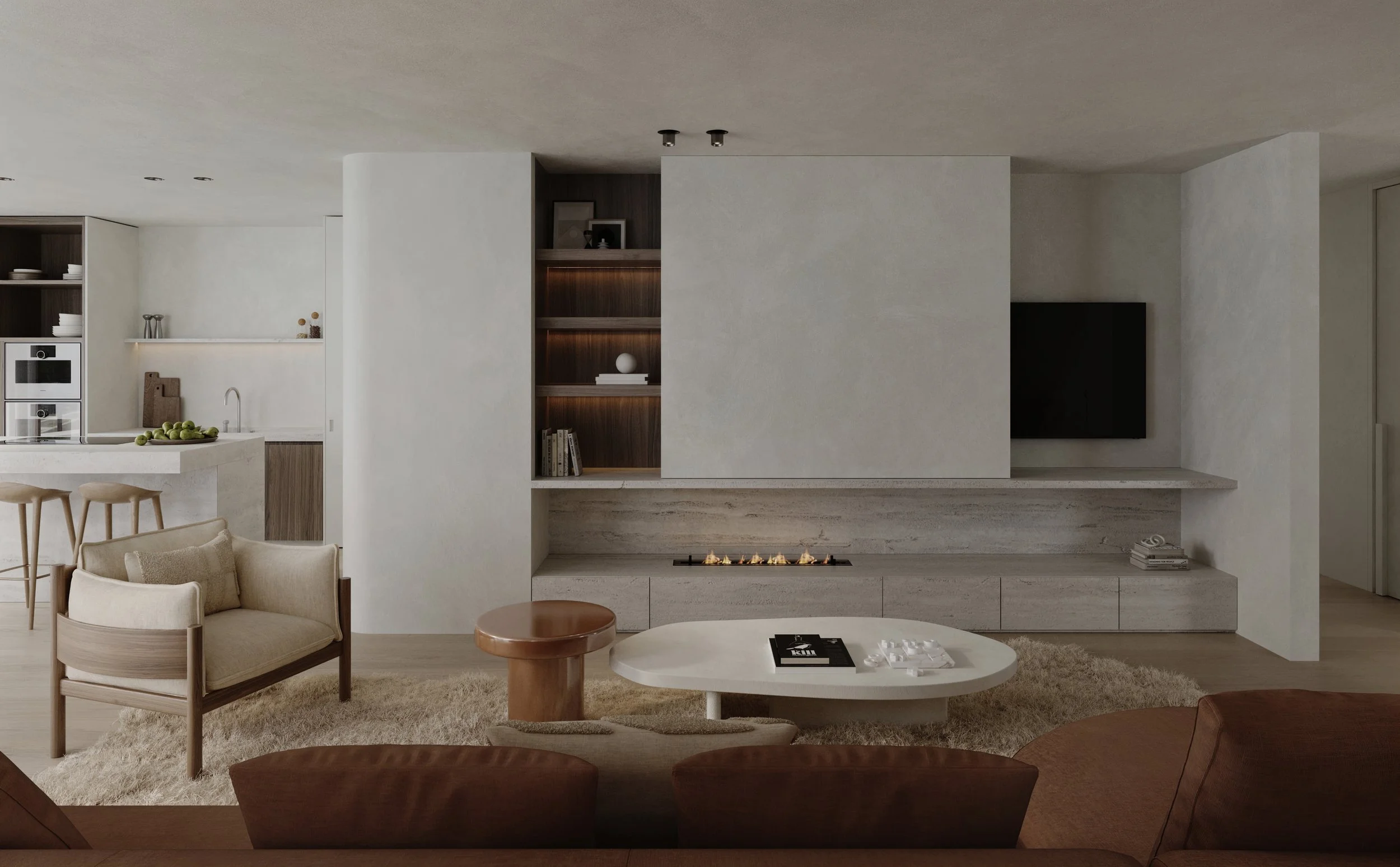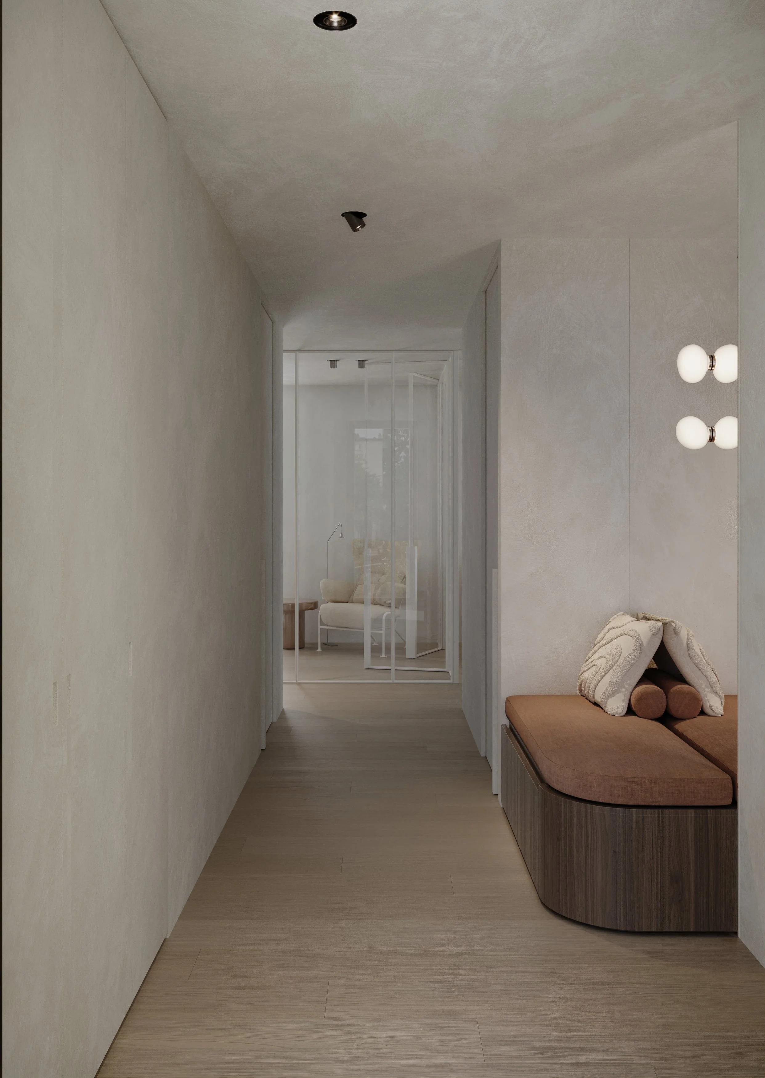 A warm and carefully balanced material palette defines the character of the spaces, combining natural textures with a subtle sense of luxury. Custom-made elements and refined finishes enhance the calm and sophisticated atmosphere throughout the apartment.